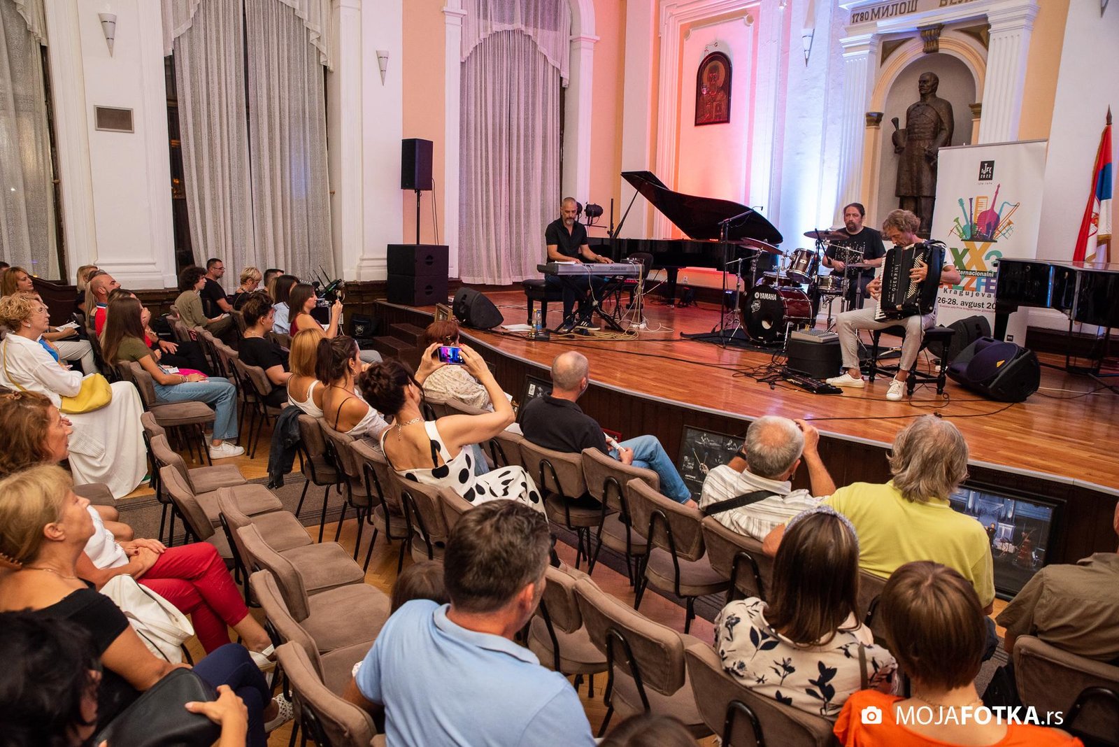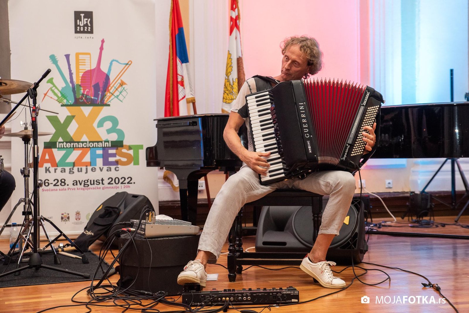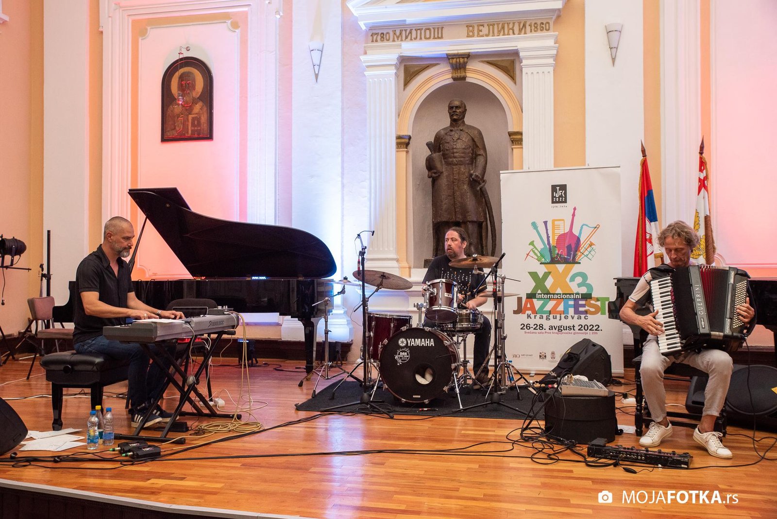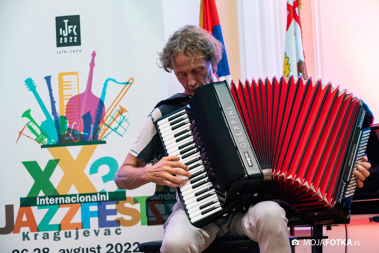 Fotografisanje 23. Internacionalnog džez festivala, koji je održan od 26-28. avgusta 2022. godine u svečanoj sali Prve kragujevačke gimnazije u Kragujevcu. Nastupili su: Miško Plavi Trio u sastavu Miško Plavi, Vasil Hadžimanovi i Miroslav Tovirac (Beograd), Slatec (Nemačka), Jasna Jovićević u sastavu Quinary (Beograd) i Antonie & Off Ground Ensemble, (Severna Makedonija)